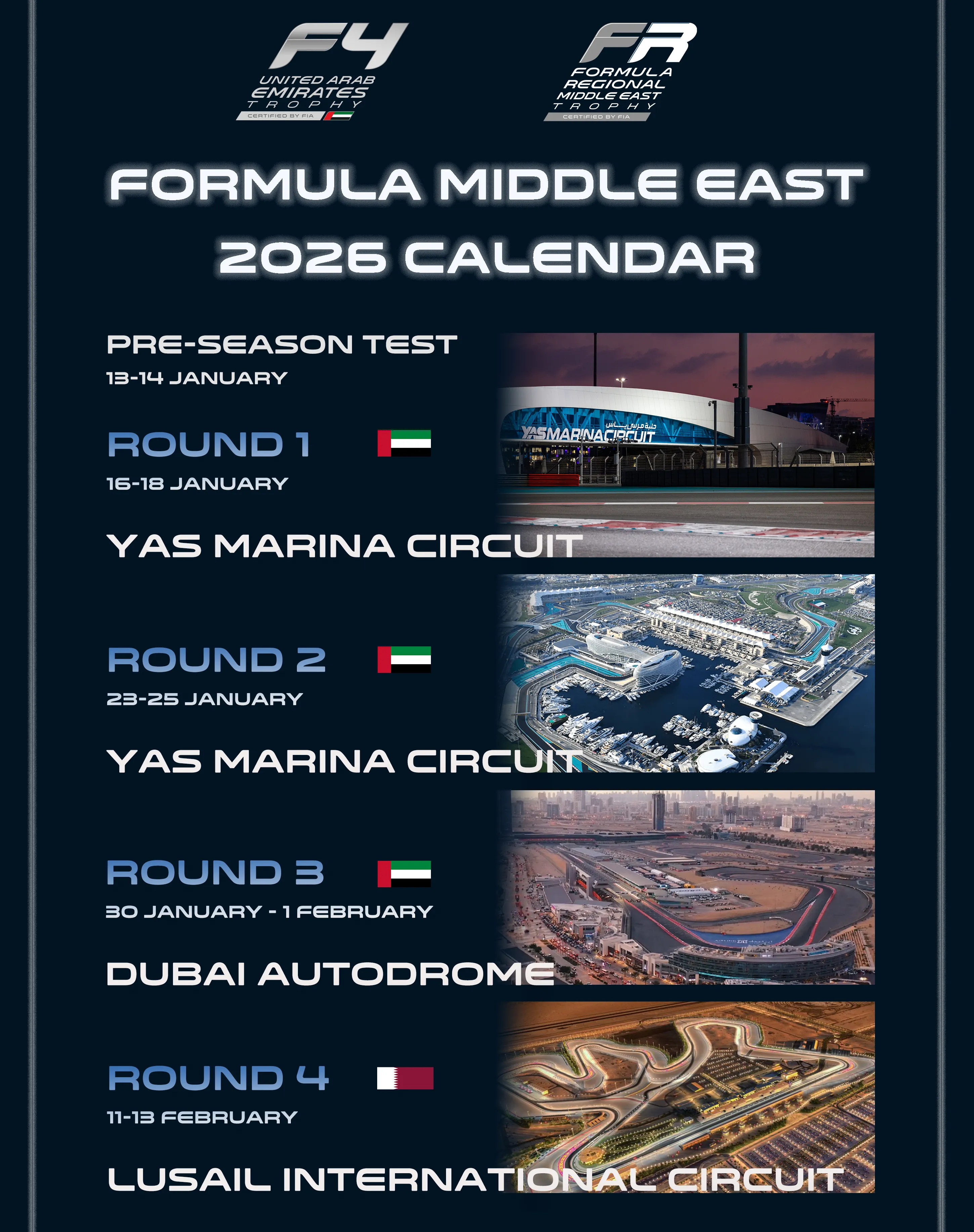 Die kompakte Saison mit vier Events und zwölf Rennen bietet viel Streckenzeit – von Testfahrten über Trainings und Qualifyings bis zu je drei Rennen pro Wochenende. Nach den beiden Auftaktrunden in Abu Dhabi (Yas Marina Circuit) geht es weiter zum Dubai Autodrome, bevor das Finale vom 11.–13. Februar auf dem Lusail International Circuit in Katar stattfindet.